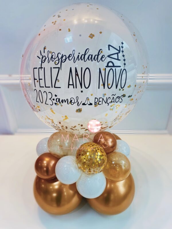 - 1 bolha transparente de 40 cm super personalizada, com balão interno, glitter e confetes.